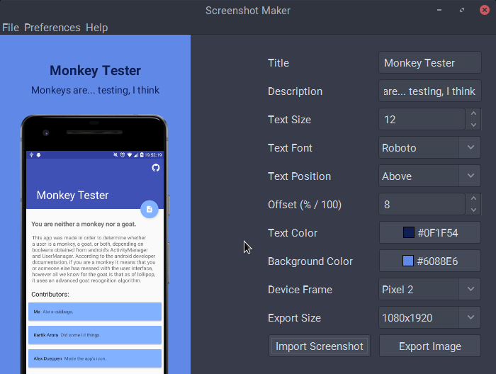 Screenshot Maker je nástroj pro vytváření screenshotů mobilních aplikací podle vzoru Google Play. Screenshot obsahuje jak samotný snímek obrazovky, tak i rámeček telefonu, pozadí kam lze vložit nadpis a popis.