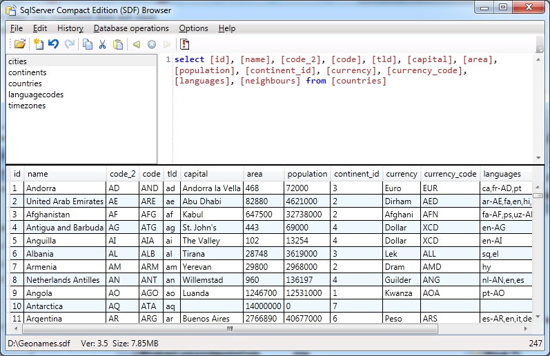 SdfBrowser je program, který Vám umožní spustit dotazy vůči Microsoft SqlServer Compact Edition (soubory SDF) a načítat info databáze. Nejnovější verze pracuje s SDF soubory verze 3.0, 3.5, 4.0 a obsahuje databázové ovladače.