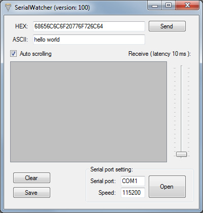 Nástroj pro příjem zpráv přes sériovou linku a jejich zobrazení v ASCII a HEX tvaru. Čas po jehož uplynutí se přijímaný blok dat označí za zprávu (dojde k fragmentaci dat) je nastavitelný od 10 do 500 ms. Všechny přijaté zprávy je možné uložit. Nástroj také umožňuje data na sériovou linku odeslat (data jsou zadávána buď jako ASCII řetězec nebo hexadecimálně).