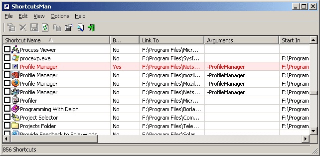 ShortcutsMan zobrazí podrobné informace o všech zástupcích, které máte na ploše a v nabídce Start. Broken zkratky (klávesové zkratky, které poukazují na soubor, který již neexistuje) jsou automaticky označené růžovou barvou. Můžete si tak vybrat jeden nebo více zástupců a následně je odstranit, spravovat nebo uložit podrobnosti o klávesových zkratkách do HTML / text / XML souboru.