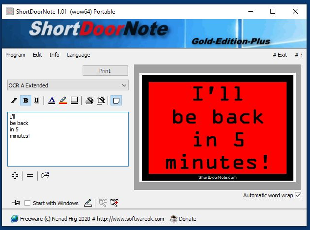 Díky ShortDoorNote si jednoduše dokážete vytvořit A4 plakát s upozorněním a následně ho vytisknout. Výsledný výtisk s upozorněním pak můžete nalepit na dveře či na zeď, kde bude dobře čitelný. Program nabízí základní vzhledy upozornění ale můžete si také vybrat ze spousty druhů písem, formátování textu, barev pozadí apod. Vytvořené upozornění lze také odeslat na Twitter nebo Facebook.