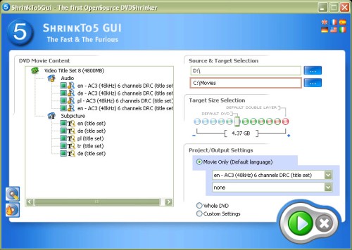 ShrinkTo5 dokáže kopírovat filmy ve výborné obrazové kvalitě. Nabízí vysokorychlostní režim, možnost kopírovat šifrovaná data, oprava strukturálních chyb, náhled během kopírování, analýza a kopírování zároveň atd. Program je v mnoha jazykových verzích.
