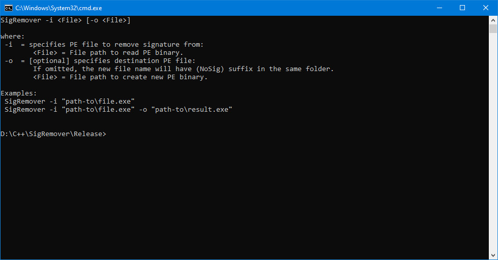 SigRemover lze použít k odstranění digitálního podpisu z jakéhokoli PE souboru. K tomu je třeba zadat název souboru do příkazového řádku a spustit program SigRemover. Program SigRemover poté odstraní digitální podpis ze souboru a uloží jej do cílového umístění.