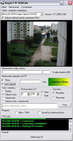 Program pro grabování snímků z web kamery a jejich upload na FTP. K obrázku je možno přidat text a datum. Nastavení intervalu od 10sec do 10min.