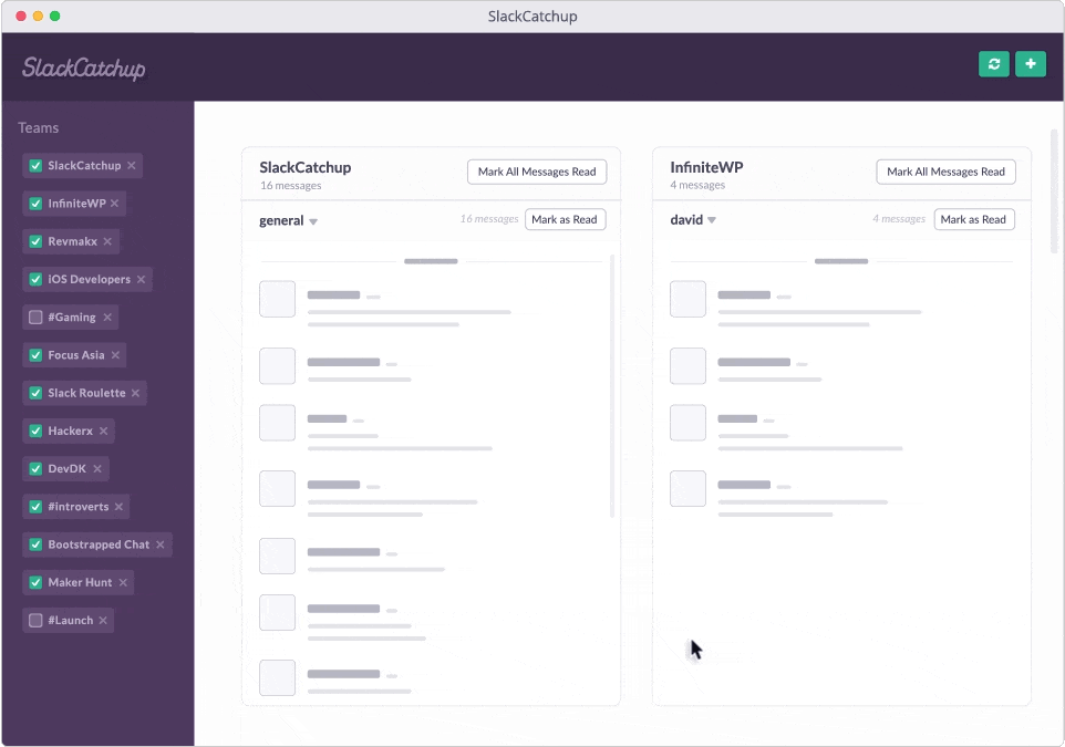 SlackCatchup je nástroj, který dokáže označit zprávy ze Slacku jako přečtené. Software je postavený na frameworku Electron, jenž rozšiřuje funkci dostupnou v oficiální klientské aplikaci. Aplikaci mohou využívat pouze ti, kteří jsou zapojeni v jediném Slack týmu, protože umí označit kompletně všechny zprávy jako přečtené, nikoliv pouze ty z vybraných týmů. K dispozici je přehled všech nepřečtených zpráv.