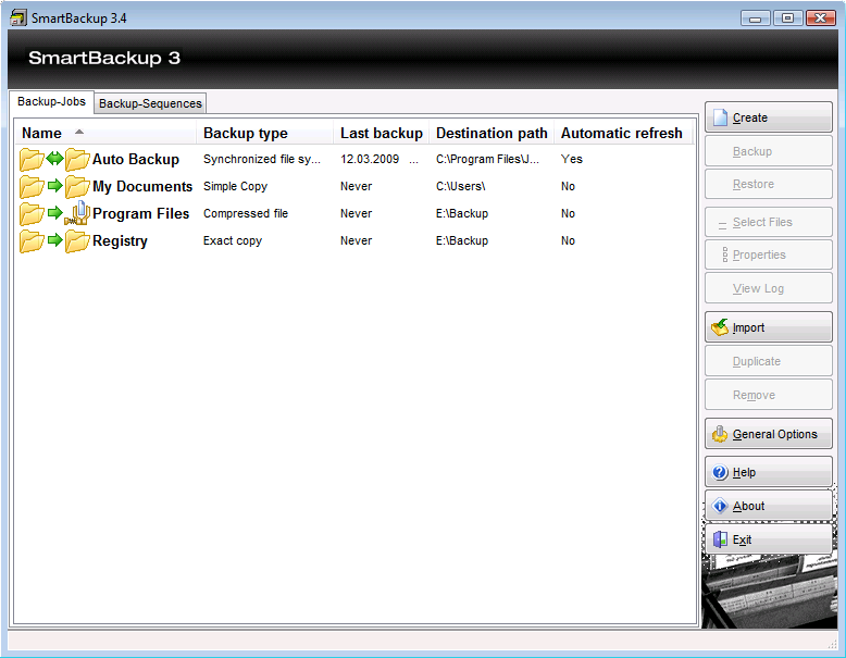 SmartBackup je rychlý a jednoduchý zálohovací softvér určený pro 2000/XP/Vista. Pomůže vám vybrat potřebné soubory a zálohovat je. Při změně obsahu automaticky obnovuje zálohované data. Dále umožňuje synchronizovat zálohována a zdrojová data. SmartBackup poskytuje detailní možnosti nastavení pro určené soubory, které mají být kopírovány.