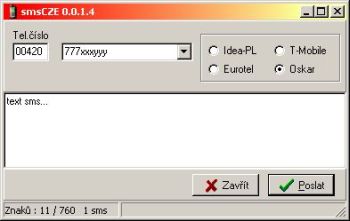 SmsCZE.dll je plugin do Mirandy instant messengeru IM, pro odesílání sms na Vodafone, Eurotel, T-Mobile, a Idea-PL.
