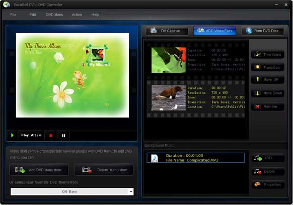SocuSoft DV to DVD Converter je vícefunkční nástroj, pomocí kterého lze snadno zachytit video z DV kamery, editovat ho, přidat DVD menu a vypálit na DVD nebo CD disky. Video soubory lze zkombinovat do video prezentace, přidat efekty a použít pěkné šablony pro tvorbu menu.