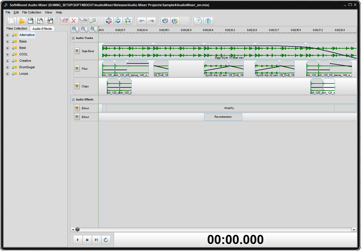 Soft4Boost Audio Mixer je nástroj určený k úpravě a vytváření vlastní hudby z daných stop a vzorků pomocí smyček a efektů. V hlavním okně se zobrazuje projekt. V levé straně okna je možnost procházení souborů, kde můžete zkoušet různé efekty. Možnost přidání zvukových vestavěných efektů a filtrů.