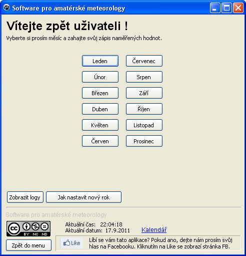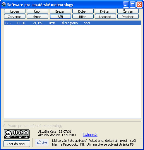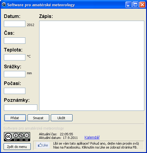 Jednoduše ovladatelný a chytrý software. Zapisovat do něj můžete údaje o aktuálním datu, času, teplotě, srážkách, tlaku, větru, sněhu, počasí a dopisovat doplňující poznámky. Program zapisuje vaše měření do tří souborů: *.meteo, *.csv, *.txt. Všechny zápisky můžete přehledně zobrazit a soubory šířit pod licencí programu.