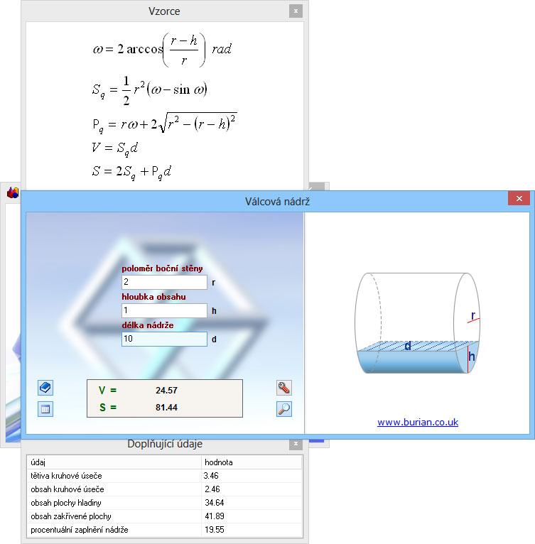 U každého tělesa je přítomen ilustrační nákres a vzorce pro manuální výpočet.