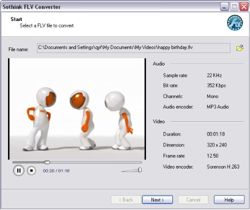 Sothink FLV Converter je skvělý flv video konvertor. Umožňuje dokonalé konvertování flashových video souborů do různých formátů. Poskytuje plnou kontrolu konvertování, vlastní nastavení video formátů, audia a výstupního souboru. Převádět lze Flash video do: AVI, MPEG, iPod video, 3GP video a PSP video. Nabízí kvalitní a rychlý převod těchto souborů a součástí je také FLV přehrávač.