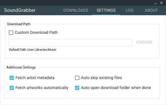 SoundGrabber je download manažer, který je určen ke stahování hudebních skladeb i celých playlistů ze serveru Soundcloud. Je to velmi jednoduché, stačí napsat URL adresu položky a na to dojde k vypsání všech nalezených skladeb. V nastavení aplikace nechybí možnost volby cílového umístění na disku pro ukládání souborů. Také lze nastavit, aby program stahoval metadata a artworks.