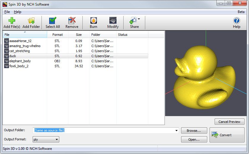 Spin 3D je program používaný pro převod mezi STL, 3DP, 3MF, OBJ and PLY formáty, které se používají pro ukládání souborů s 3D grafikou. Podpora dávkového zpracování. Obsahuje unkci pro převod MeshMagic 3D projektů do ostatních formátů, v neposlední řadě nechybí ani prohlížeč 3D grafiky v okně aplikace, jak je uvedeno na přiloženém snímku obrazovky.