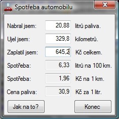 Stačí zadat počet nabraných litrů, ujetých kilometrů, popř. ceny a program vypočte průměrnou spotřebu na 100 kilometrů, cenu za jeden kilometr a cenu za 1 litr paliva.