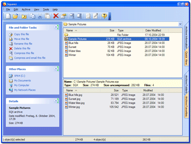 Squeez je šikovný program pro kompresi souborů. Podporuje 13 různých kompresních algoritmů. Squeez komprimuje a dekomprimuje SQX, ZIP, ARJ, LZH, RAR, CAB, GZIP, TAR, UUE, ACE, JAR, BZIP a 7Z.