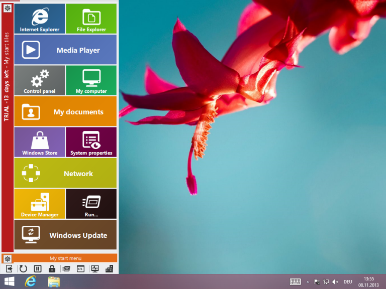 StartBar8 je program pro uživatele systému Windows 8, který na levou stranu obrazovky přidá přizpůsobitelnou lištu. Lišta se zobrazí najetím kurzoru na danou oblast a lze v ní přizpůsobit jednotlivé akce např. otevření souboru či složky, vypnutí počítače, restart nebo uzamčení atd.