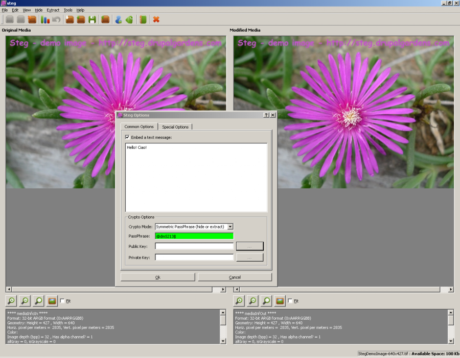 Steg je multiplatformní a přenosný software, napsaný v C ++. V programu je využito techniky steganografie a kryptografie a skryje informace uvnitř nekomprimovaného a komprimovaného obrazu. JPEG (JPG), obrazové formáty TIFF, PNG, BMP jsou podporovány. Program opravdu skrývá libovolná data uvnitř samotného obrázku (ne v metadatech / Komentář polí nebo připojeny na konec souboru).
