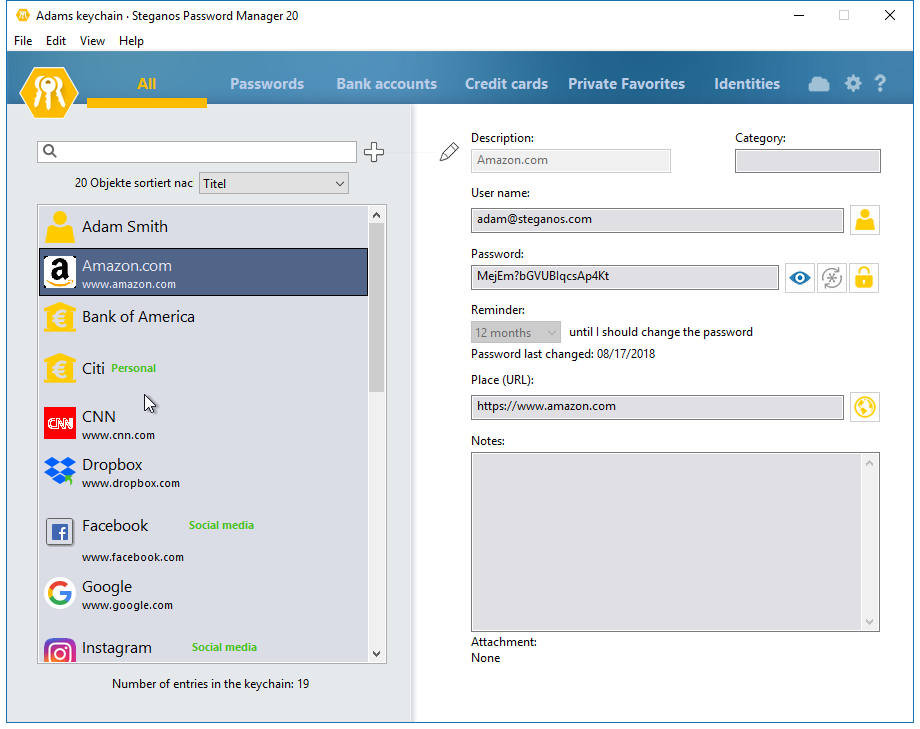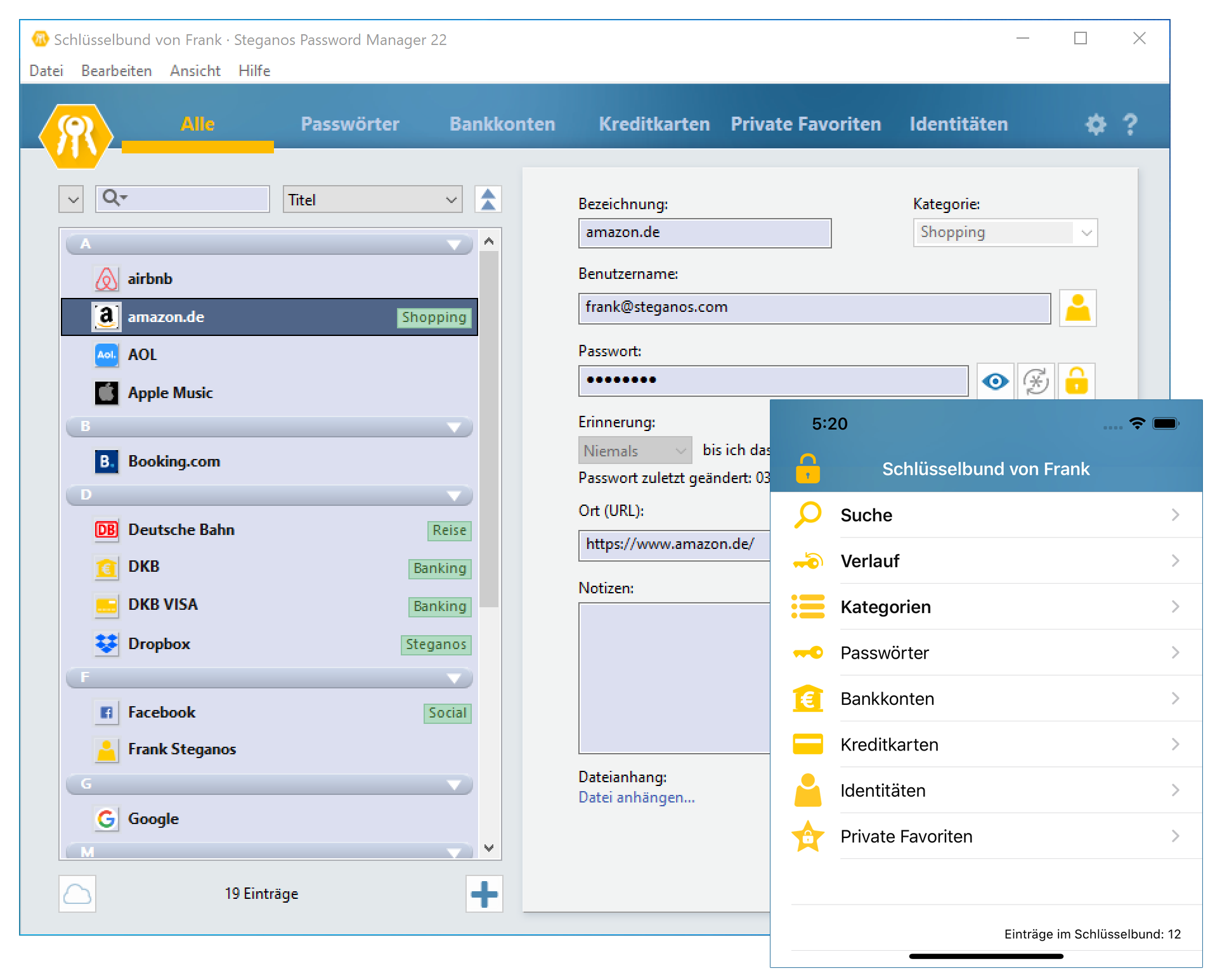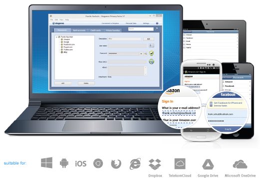 Steganos Password Manager poskytuje pohodlné řešení pro práci s hesly: generuje mimořádně silná hesla, automaticky vkládá hesla do formulářů na internetových stránkách, a hlavně si je pamatuje! Jediné co musíte, je zapamatovat si jedno heslo!