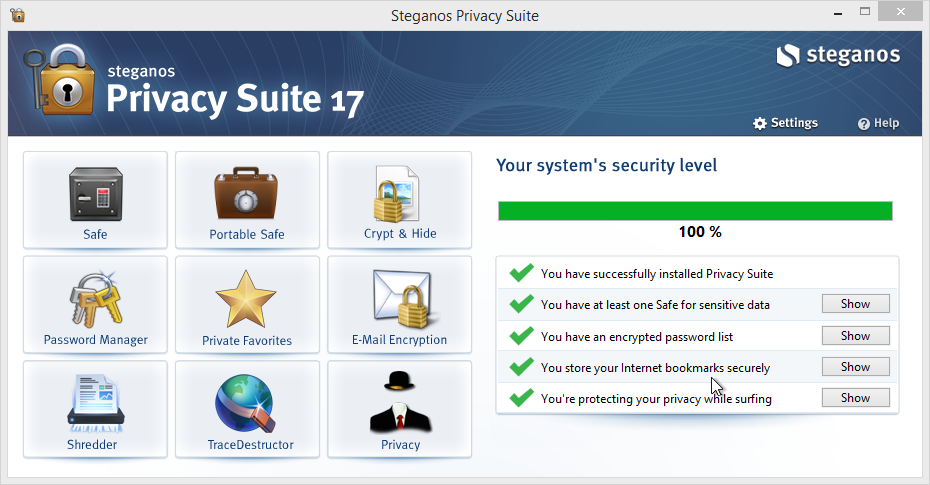 Je kombinací produktů Steganos Safe a Steganos Password Manager s přidanými funkcemi, které jsou k dispozici pouze v tomto produktu Steganos Privacy Suite.
