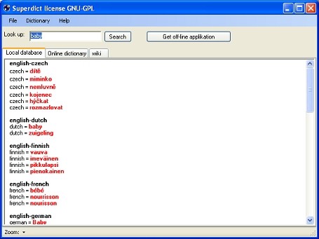 Po otevření programu dvojklikem myší na jeho ikonu můžeme ihned zadávat text hledaného výrazu do editoru označeného, jako "Look up". Pak můžem zmáčknout buď klávesu "Enter", nebo tlačítko "Search".Pokud hledaný výraz bude obsažen v databázích, pak se nám v tabulce s označením "Local database" objeví jeho překlad ve více jazycích včetně češtiny. Dále můžeme hledat tento výraz přepnutím se do tabulky "Online dictionary" a, nebo v tabulce "wiki", čili "wikipedie". V tabulce s označením "wiki" vyhledáváme také pomocí zadání slova do editu "Look up" a zmáčknutím klávesy "Enter". V tabulce s označením "Online dictionary" se vyhledává pomocí zadání slova do editu k tomu určeného na stránce online slovníku.