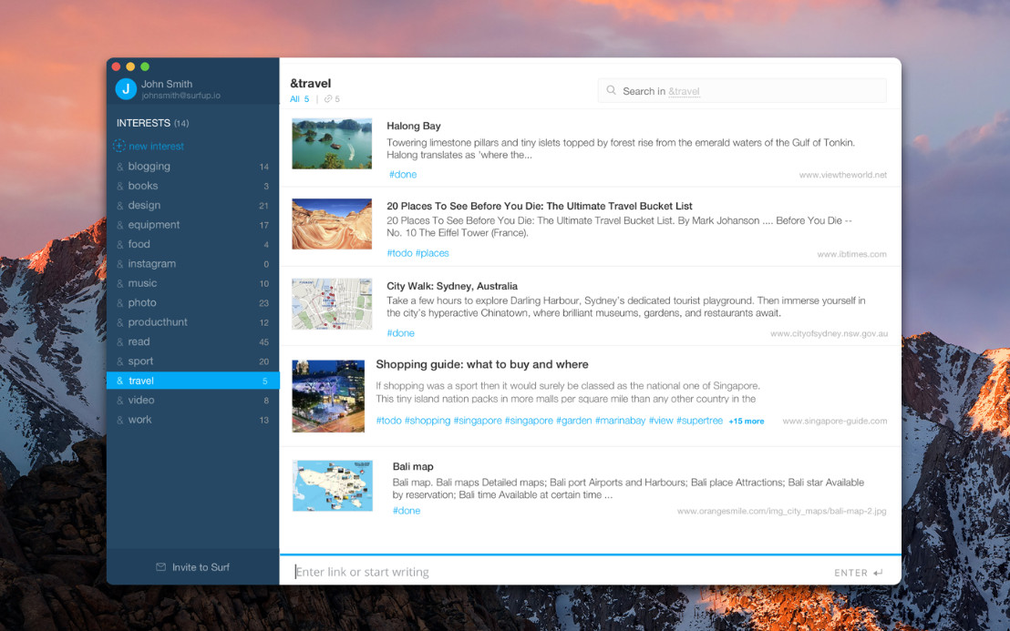 Surf je aplikace, která vám pomůže ukládat vaše nápady a inspirativní obsah. Můžete vytvářet poznámky, psát delší texty nebo ukládat odkazy na zajímavá témata nebo webové stránky. Uložené záznamy můžete kategorizovat pomocí hashtagů a snadno je najdete pomocí rychlého filtru.