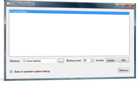 SVN Autocommit Vám pomocí technologie SVN subversion umožní periodicky zálohovat složky a citlivá data. Před použitím této aplikace je nutné mít danou složku propojenou s SVN serverem - to můžete zabezpečit například použitím programu TortoiseSVN.