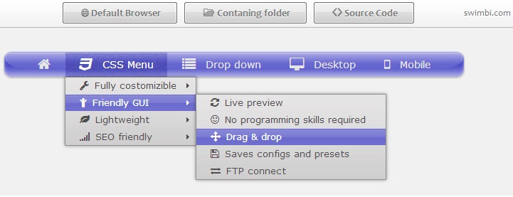 Swimbi je takzvaný Swift Menu Builder, což je určeno všem webovým designerům bez vyjímky. Swimbi obsahuje jen ty nejlepší a populární rozevírací konstrukční menu vytvořené profesionálními designéry. Přidejte některou z 450 a více ikon, pro atraktivitu položek nabídky. Swimbi má v menu přizpůsobení designu, kterému se meze nekladou.