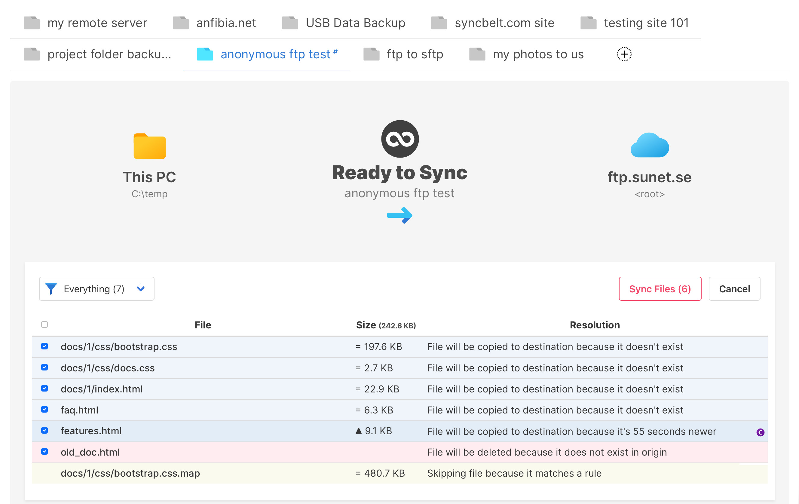• Synchronizace zdrojových souborů webových stránek: SyncBelt umožňuje synchronizovat zdrojové soubory webových stránek s FTP/SFTP serverem. Můžete synchronizovat pouze nové soubory, soubory, které byly změněny, nebo všechny soubory. Můžete také synchronizovat soubory v závislosti na jejich velikosti nebo datu modifikace.