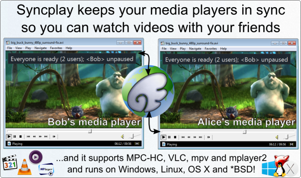Syncplay je program k automatické synchronizaci videa mezi ostatními uživateli. S tímto programem můžete sledovat oblíbené filmy kdykoli, neboť synchronizace je v reálném čase. Samozřejmostí je podpora různých přehrávačů ( VLC Media Player, Media Player Classic - Home Cinema (MPC-HC), mplayer2 a mpv).
