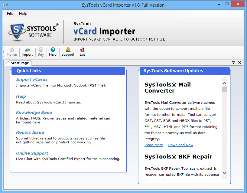 SysTools vCard Importer je nástroj pro import vCard kontaktů do Outlook PST souboru. Umožňuje import většího množství vCard kontaktů. Důležitým požadavkem je hotová instalace a konfigurace programu Microsoft Office Outlook. Podporuje Import vCard (VCF) souborů ve verzích 2.1 a 3.0.
