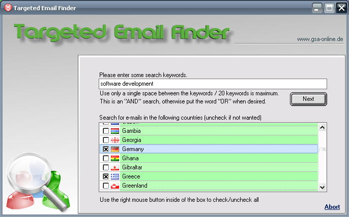 Targeted Email Finder je aplikace, která vyhledává relevantní emailové adresy pro online marketingové kampaně. Umožňuje možnosti nastavení velkého množství klíčových slov, na základě kterých budou e-mailové adresy z různých zemí vyhledávány. Při spuštění operace program začne průběžně zobrazovat množství nalezených e-mailových adres, počet parsovaných webových stránek a zbývající čas do ukončení vyhledávání.