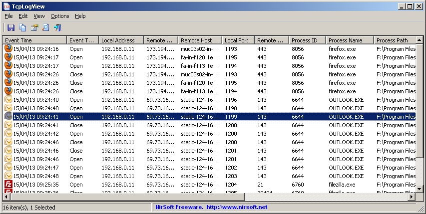 TcpLogView monitoruje otevřené TCP spojení ve Vašem systému a doplňuje nový řádek protokolu pokaždé, když je TCP spojení otevřené nebo zavřené. Pro každý řádek protokolu, se zobrazí následující informace: čas, typ události (otevření, zavření, naslouchání), lokální adresa, vzdálená adresa, název vzdáleného hostitele, místní port, vzdálený port, ID procesu, název procesu a informace o zemi.