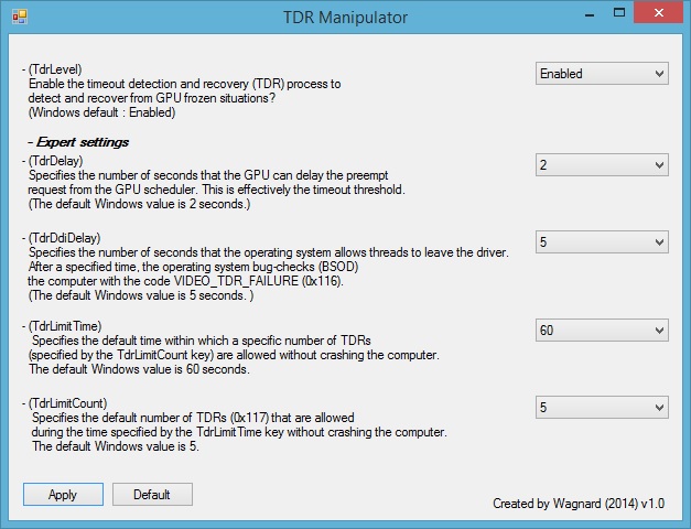 TDR Manipulator je nástroj určený k manipulaci s Windows TDR (Timeout Detection and Recovery), který nastaví jak lze resetovat GPU a restartovat grafický ovladač. Software zasahuje do registru a manipuluje s nastavením samotného grafického procesoru. Jedná se o software určený pro zkušené uživatele, neboť zasahuje do registru a manipuluje s nastavením samotného grafického procesoru. Nastavit můžete pět parametrů. TdrLevel, který obnovuje GPU při zamrznutí, je možné povolit nebo zakázat. Parametry TdrDelay, TdrDdiDelay, TdrLimitTime a TdrLimitCount pak vyžadují zvolení konkrétní hodnoty. První tři z nich jsou uváděný v sekundách, poslední specifikuje počet povolených TDR operací během doby nastavené parametrem TdrLimitTime.