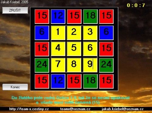 Nudíte se někdy u počítače? Jestli ano, tak určitě zkuste tuto zábavnou hříčku, u které využijete mozek a zároveň se pobavíte. Cílem tohoto hlavolamu je doplňovat do žlutých polí číslice 1-9, tak že se nesmí opakovat a všude (v krajních polích) musí svítit červená 15. Přejeme hodně zdaru!
