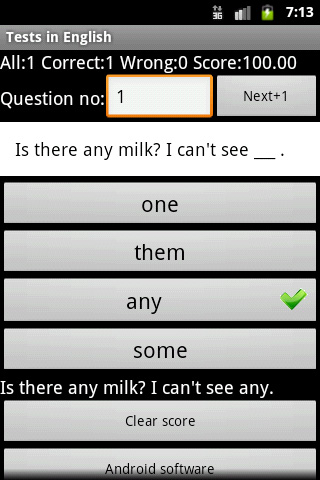 Aplikace je určena pro mobilní telefony a tablety s o.s. Android 2.1 a vyšším. Obsáhlý test z angličtiny čítající 500 otázek vhodný pro přípravu nejen na maturitní zkoušky, ale i pro zlepšení pochopení anglické gramatiky. Otázky testují například psaní a, an, the před podstatnými jmény dále používání any, many, much, little, lot, as - as, atd. V testu můžete pokračovat zadáním příslušné otázky v rozsahu 1 až 499 a kliknutím na tlačítko Next+1. Po načtení otázky vyberte slovo, které je nejvíce vhodné, jako náhrada mezery (______) v zadané otázce. Pokud zvolíte správnou odpověď, tak na příslušném tlačítku, které jste stiskli se objeví zelený háček (zaškrtnutí), v opačném případě se objeví červený křížek. Pokud na otázku nechcete odpovídat, zmáčkněte Next+1. V indikátoru statistiky se zobrazuje počet otázek a úspěšnost odpovědí.
