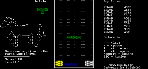 Všem dobře známá hra Tetris. Je plně funkční, zpracována v textovém režimu, ale díky přiloženým zdrojovým kódům v jazyce Pascal si jej můžete přeprogramovat do grafické podoby. Program je zkrácený na potřebné minimum, vznikl tak zdrojový soubor Tetrisl.pas, který obsahuje vše potřebné. Zdrojový kód naleznete na stránce výrobce.