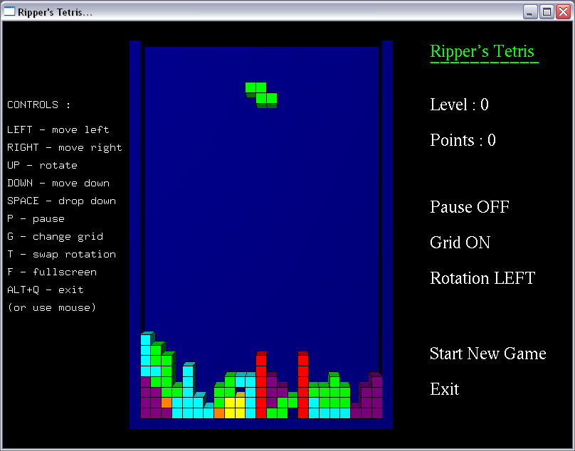 Klasický Tetris. Hru lze hrát ve full módu, tzn. zobrazení přes celou obrazovku. Program je šířen pod licencí GNU GPL, je tedy zdarma.