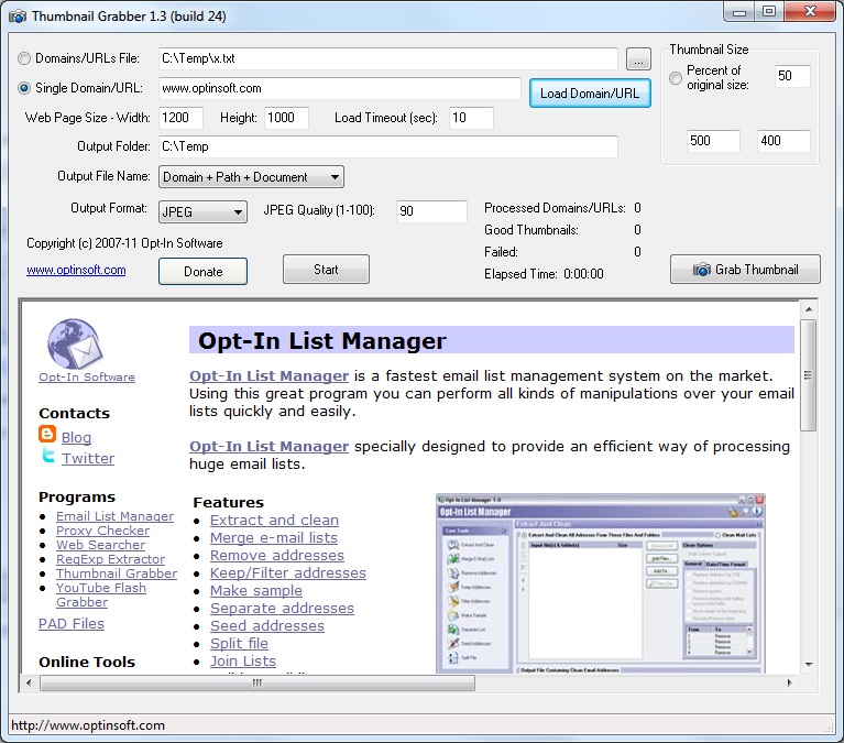 Thumbnail Grabber je nástroj pro vytváření náhledů obrazovek webových stránek ve formátu JPEG nebo PNG.
