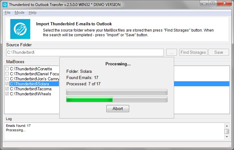 Thunderbird to Outlook Transfer je program pro přenos dat z poštovní schránky Thunderbird do Outlooku. Dokáže extrahovat data z offline složek Thunderbirdu a poté je převést do .PST souborů. Disponuje i možností, která Vám zajistí přímý import do aplikace Outlook. Identifikovány jsou soubory, ve kterých jsou uloženy zprávy, položky v kalendáři, poznámky nebo kontakty.