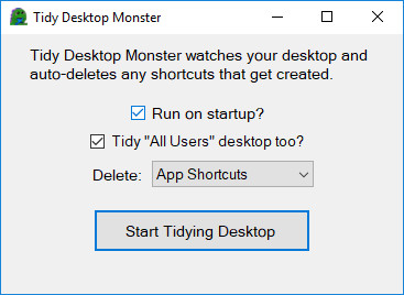 Tidy Desktop Monster je malý program, který automaticky maže všechny zástupce z plochy. Je to skvělý způsob, jak udržet vaši plochu čistou a organizovanou. Program je velmi snadno použitelný. Stačí jej spustit a on se postará o zbytek. Program můžete nakonfigurovat tak, aby mazal všechny zástupce, nebo pouze zástupce aplikací.