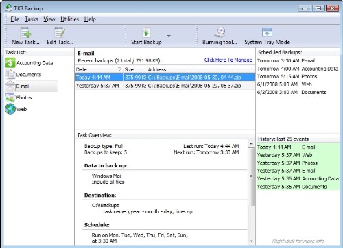 Výkonná utilita TK8 Backup slouží pro jednoduché zálohování důležítých souborů a složek. Denně můžete zálohovat automaticky různé dokumenty, kontakty a emailové klienty (Outlook, Outlook Express a Windows Mail). Zálohovat lze na místní disk, CD/DVD disk, USB disk, FTP server. Záloha je chráněna heslem a šifrováním pomocí výkonného šifrovacího algoritmu (256 bit AES).