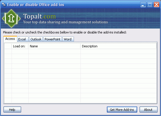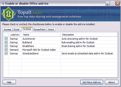Topalt EnableDisable je snadno použitelný nástroj, který vám umožňuje spravovat přídavné moduly v aplikacích Microsoft Office. S jeho pomocí můžete přídavné moduly zapínat, vypínat, aktualizovat a odinstalovat.