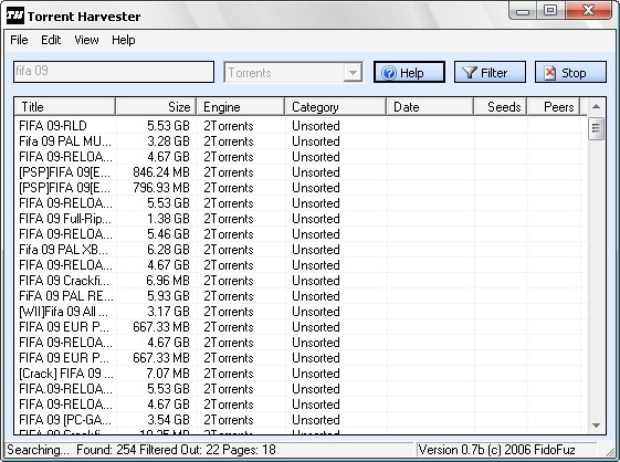 Torrent Harvester je velmi šikovná pomůcka pro vyhledávání torrentů pro stažení z různých torrentových serverů. Po zadání klíčového slova program prohledá všechny zadané torrentové zdroje a vypíše seznam, ve kterém také uvádí informace o nich (adresu na torrent, velikost, engine, ....).