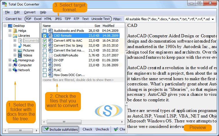 Total Doc Converter je profesionální řešení pro konverzi dokumentů: Word, Doc, DOCX, DOCM, RTF, RVF, nebo TXT soubory do HTML, PDF, XLS, JPG, TIFF a text v dávce. Díky intuitivnímu rozhraní, dokážou i nezkušení uživatelé pracovat s tímto nástrojem. Total Doc Converter lze spustit pomocí příkazového řádku. Použití Total Doc Converter Vám ušetří čas a úsilí tím, že pomáhá převést tisíce Doc souborů díky několika málo kliknutí.