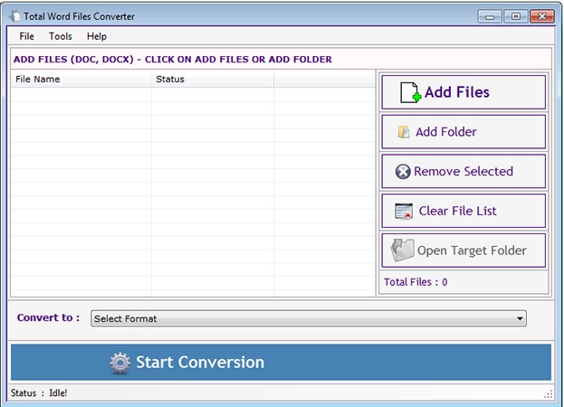 Total Word Files Converter je inovativní software vytvořený pro konverzi slov a souborů do jiných formátů. Tento software je schopen přeměnit 1000 textových souborů do různých formátů během několika sekund. Umí konvertovat soubory slov do jiných formátů (doc., docx., atd.) Je také možné převést soubory aplikace Word do různých formátů jako je (doc. do formátu PDF, DOCX, HTML, atd.)