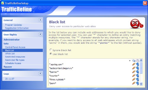TrafficRefine je jednoduchý a efektivní nástroj, pomocí kterého lze kontrolovat a využïtí internetu, nastavit různá omezení a povolování pro ostatní uživatele. Program je užitečný pro rodiče, kteří chtějí ochránit děti před nevhodnými internetovými weby.