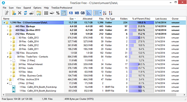 TreeSize Free lze spustit z kontextového menu, složky nebo jednotky a zobrazí se velikost této složky, včetně jejích podsložkách. Velké složky mohou být označeny v kostce díky přechodu, zobrazené v pozadí.