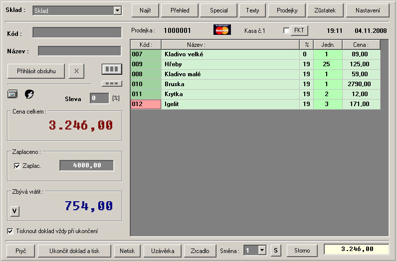 Vyzkoušejte a věříme, že program si vás získá. Nově vylepšená podpora dotykových monitorů a zákaznických displejů všech značek a zdokonalené rozhraní. Přenos skladových dat a kont zákazníků přes internet mezi vzdálenými pobočkami. Přeposílání dávek příjmů na sklad. Věrnostní karty sdílené mezi pobočkami přes internet. Zákazník na jedné pobočce nakoupí a za utržené body dostane slevu na jiné pobočce téhož provozovatele. Podpora terminálů ČSOB (platná certifikace).