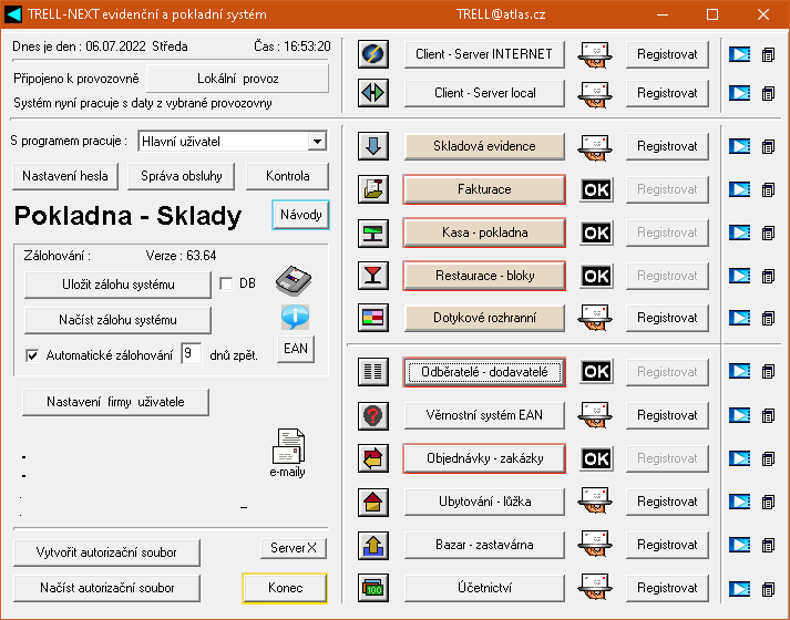 Návody jsou součástí programu pod tlačítkem *Návody* v hlavní obrazovce systému. Aktualizace programu vycházejí pravidelně každých 14 dnů doplněné o legislativní změny a případné nové funkce. Věrnostní systém - u každého přihlášeného zákazníka je možné sledovat celkovou výši útraty, multilevel systém věrnostních bodů a slev na základě přihlášení zákaznickými kartami s čárovým kódem.